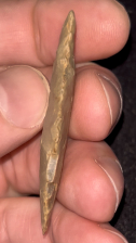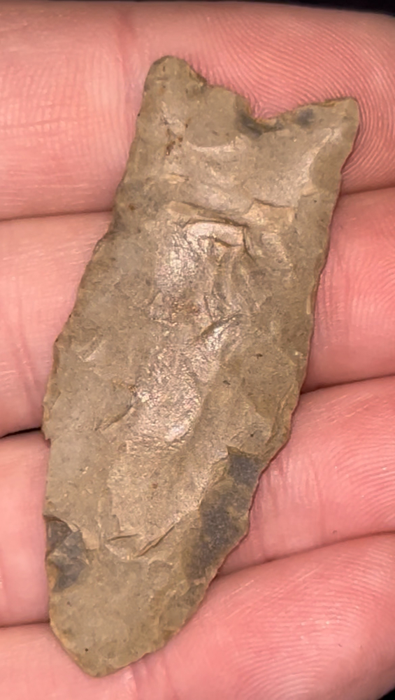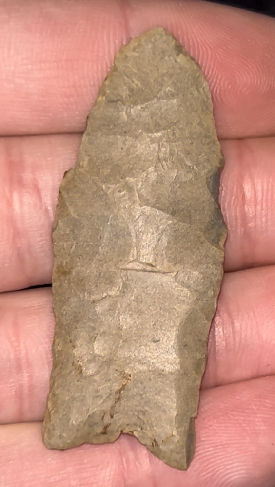 A very nice Clovis found in Kentucky. Medium grey material is heavily patinated to a light brown, as evidenced by some small nicks around the edges, with excellent mineralization. Thin and well made with nice narrow style and fluted on both sides.