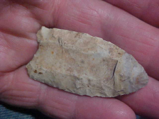 The collection had a number of Tennessee points, southern Kentucky pieces, so that's the best provenance I can provide. Authenticity, though, that's no brainer, every detail is guaranteed authentic. Made of a good grade of hornstone2&1/2" by 7/8", might have been an eighth inch longer if not for the impact fracture on the very tip--the fracture left a sharp tip, and that's all the Mid-to-Late Archaic hunter required--they didn't try to rechip a more 'perfect' tip. The point has the sort of 'thick' medial ridge of the Little Bear Creek points, and the almost total lack of basal grinding they're known for. The finder stenciled E26, but there was no catalog accompanying the estate sale--does that refer to a particular site, or county--no way to know. The point, though, is real. Shipping is $8.00 with checks or M.O>s welcomed. Sorry, I do not use paypal-type services--Roy A.