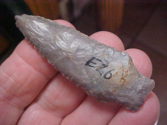 The collection had a number of Tennessee points, southern Kentucky pieces, so that's the best provenance I can provide. Authenticity, though, that's no brainer, every detail is guaranteed authentic. Made of a good grade of hornstone2&1/2" by 7/8", might have been an eighth inch longer if not for the impact fracture on the very tip--the fracture left a sharp tip, and that's all the Mid-to-Late Archaic hunter required--they didn't try to rechip a more 'perfect' tip. The point has the sort of 'thick' medial ridge of the Little Bear Creek points, and the almost total lack of basal grinding they're known for. The finder stenciled E26, but there was no catalog accompanying the estate sale--does that refer to a particular site, or county--no way to know. The point, though, is real. Shipping is $8.00 with checks or M.O>s welcomed. Sorry, I do not use paypal-type services--Roy A.