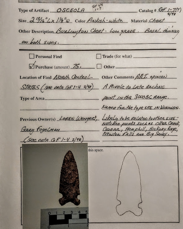 This beautiful Osceola point is very symmetrical and well-made. It was found in White Co., Illinois, and comes with a Dwain Rogers COA. It was formerly in the collections of Gary Fogelman and Loren Wengert.