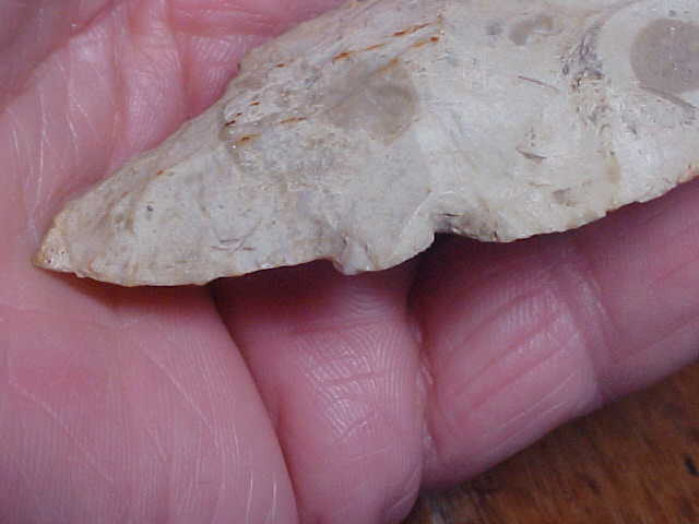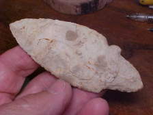 At 3&13/16", this is one big Waubesa Adena hafted knife--width is 1&1/2", but the center-of-blade thickness is only 5/16". There are enough inclusions (fossil) in the chert that I'll use the chert classification "A form of Burlington Chert"--probably somewhere in the literature there's a sub-group name for the chert type...but not easily found. Other pieces in the collection were ex Bill Pesch Collection, Mattoon, Illinois, so I'm going with "Bill's Collection" as the source of this big Waubesa--a couple years after the estate auction, pieces have gotten traded around quite a bit. It happens. Built in a lower blade corner is a WELL polished shaft scraper--maybe it started as a ding, but quickly got used for scraping wood handles and bone awls. You can easily feel the work polish. The "V" stem shows edge grinding--not super heavy, but definitely edge-ground. Neat piece, 100% guaranteed authentic. Shipping is $8.00 with checks or M.O.s the ways to pay for the purchase. Sorry, I do not use paypal-type services--Roy A.