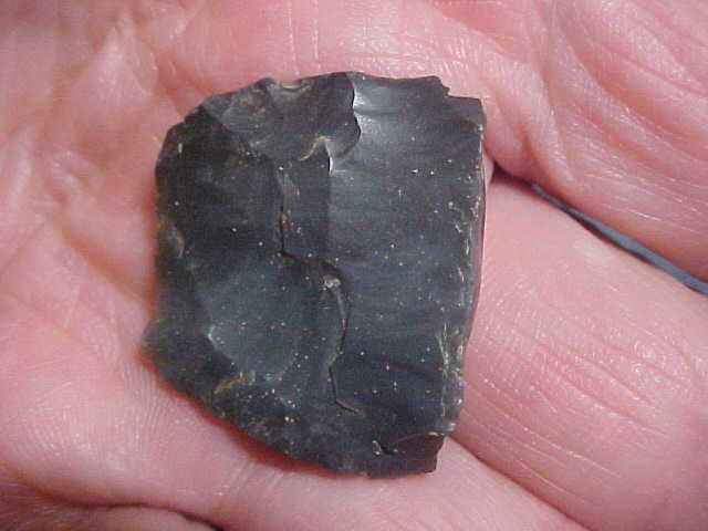 When a 'flute strike' went wrong the flute channel could 'dive' from one face towards the reverse face--look at the pics 'on end' of this broken 'almost there' Clovis, it'll make more sense that a long-winded explanation. Typically, the end is rounded, not a clean 'snap off' as you'd get on a broken point. Not being willing to let a good piece of flint go to waste, these 'flute failures' often show work polish as they were converted into end scrapers. A close up photo should show the very tiny use-made chips that tell you the piece was then used as a scraper--call it a hafted scraper (blunt), if you will--that was its purpose. Here, the hornstone is slightly over 1" in length, 1&3/16" wide, 5/16" max thickness. There was only marginal effort put into basal edge dulling, only slightly more grinding than that on the lateral edges. The finder lived in Posey County, Indiana, but much of his collection came from his growing up home near Elizabethtown, KY--the flint (if it isn't hornstone) is the Kentucky Blue Flint of his childhood home--high quality flint, regardless. Shipping is $8.00, checks or M.O.s are the two ways the piece can be paid for, but please note I do not use paypal-type services--Roy A.