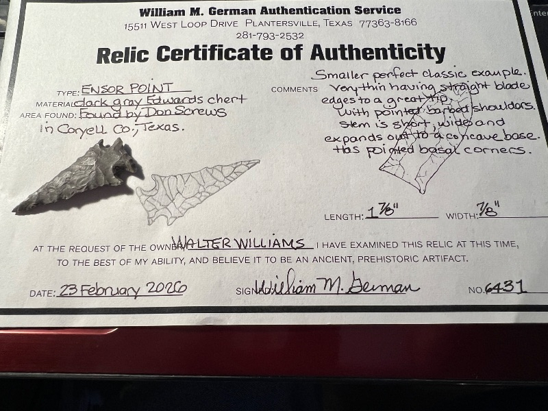 This is a classic Ensor made of Gray Edwards recovered in Coryell County - right hand bevels. It has a Bill German coa and I have the shipping.
