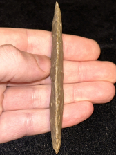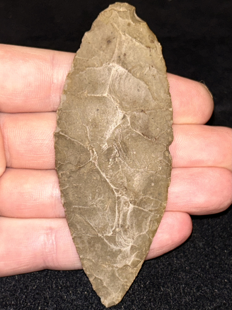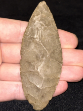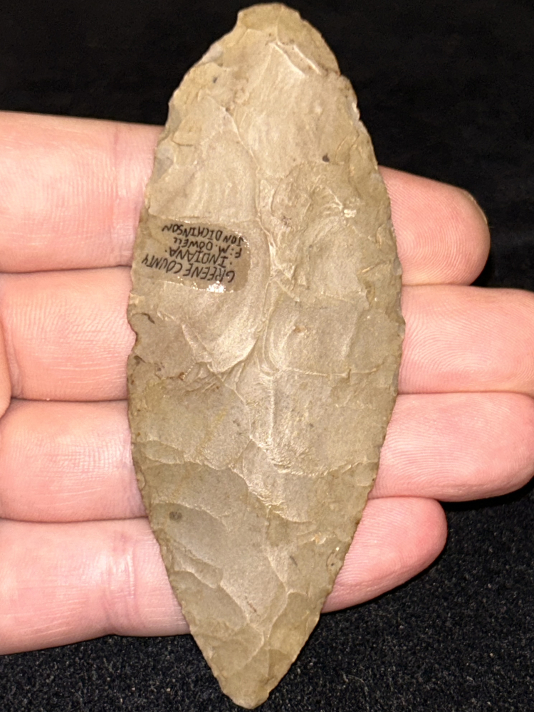 A fabulous blade found in Greene County, Indiana. Made from a heavily patinated medium brown chert. Thin with excellent workmanship and flaking. Ex: M Dowell, Jon Dickinson.