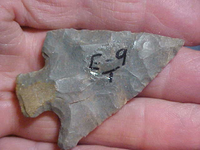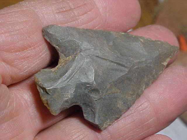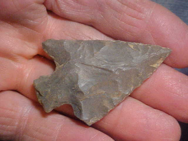 shipping included on this hornstone Buck Creek point, 2&1/4" by 1&1/2"--may have been a sixteenth wider if not for the snapped barb (ancient damage). The last owner put on some catalog numbers, but didn't indicate what those stand for (county or a particular site). Guaranteed real, just a well made Woodland Culture point. You can buy the point with a check or a money order, but I do not use paypal-type services--Roy A.