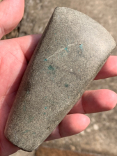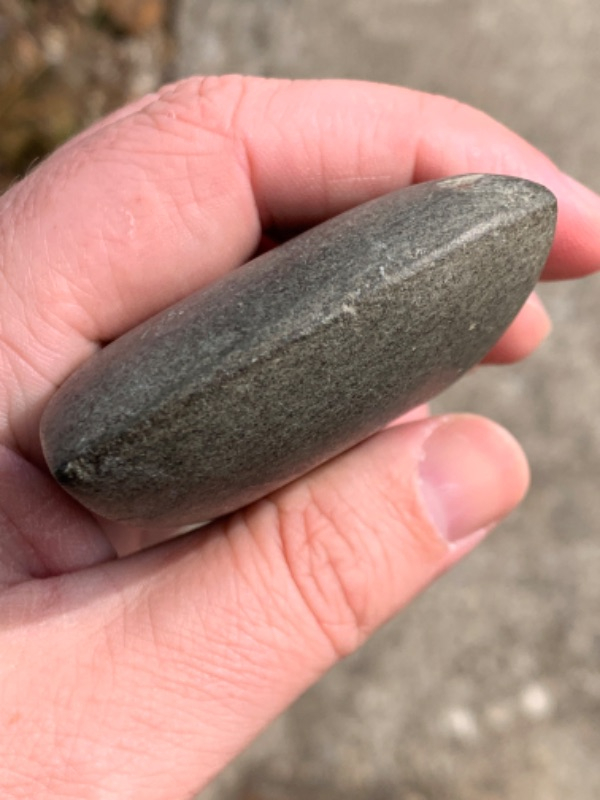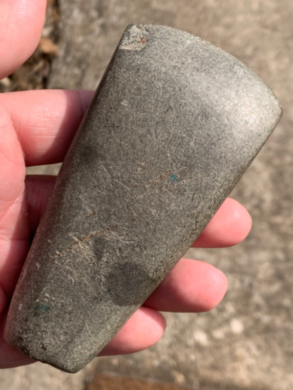 A 4 1/2” Gray Hardstone Celt, has a sharp bit and great form .