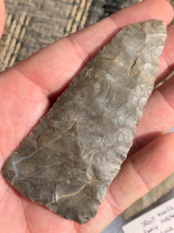 A 3 3/4” fine Archaic blade, this example is made of a beautiful light gray mottled Coshocton Chert .