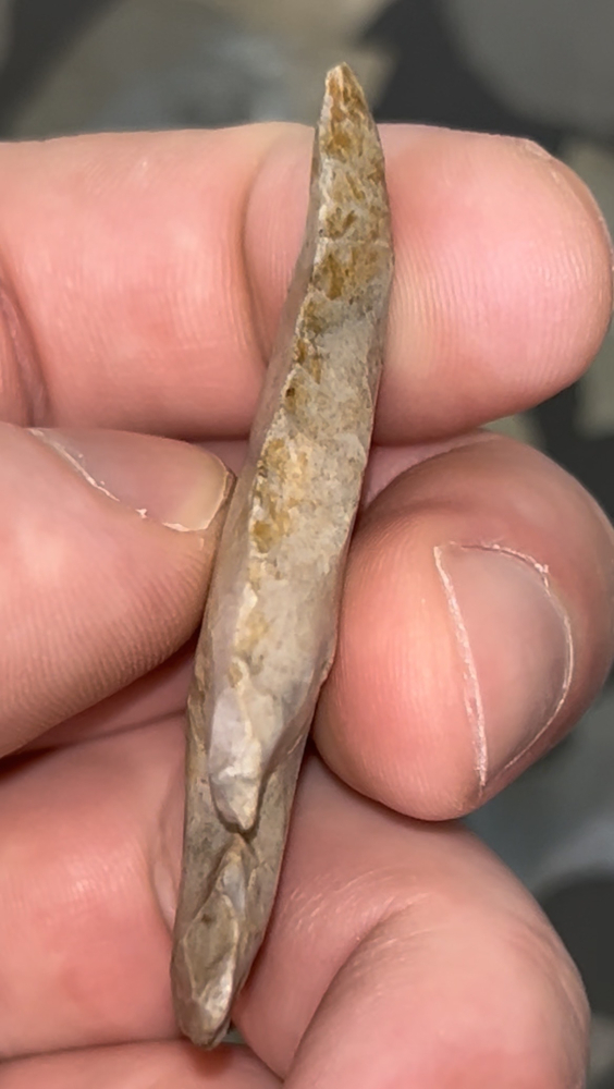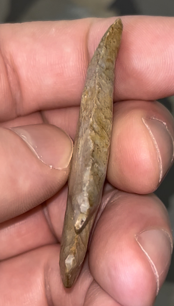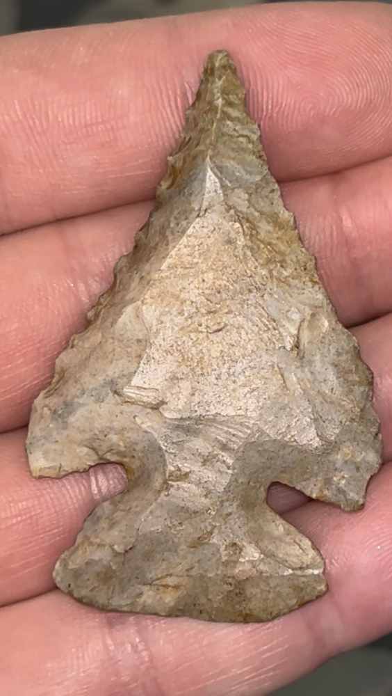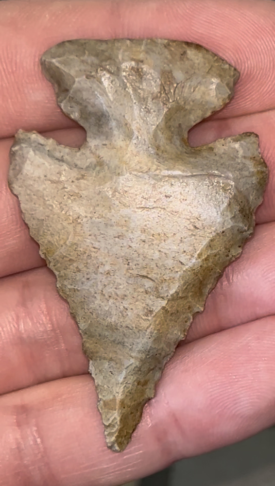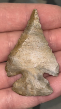 A fine Thebes found in Livingston County, Illinois. Made from well patinated Indiana Green chert. Nice style and notching with lightly serrated beveled edges.
