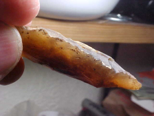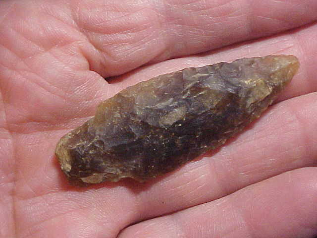 There isn't really a 'category' for Late Archaic Stemmed, not in Overstreet, anyway, but you see a slightly contracted stem, edge ground--and a lot of times with a slat stem base, you know there are elements of Eastern Stemmed, Stringtowns, point style in the same 'general characteristics' cluster, they're generally well made. Here, this 'rootbeer chert', it was a super-hard flint, you see 'stacks' that the ancient knapper couldn't eliminate due to the blade already being narrow (2&1/2" by 7/8", and thickness that reaches 1/2")--it's a Lanceolate type blade which is why it's narrow. With a backlight, you can easily guess why the knapper wanted to work a difficult flint, the translucence had to appeal to someone thousands of years back as much as a collector today. Now, does the flint have a more specific name, Tony DeRegnaucourt's chert type book calls it Flint Ridge Moss Agate Variety. I've found it along the Ohio River, but RARELY--this point was from a Kentucky dealer, it's a piece that you see, you want it for your collection. There is likely some soil still in the crevices of the stone--I didn't want to scrub it; the soil, still in those crevices, tells you about where the piece originated. It is guaranteed real in every detail. Shipping is included with the price, nothing additional. I take checks, money orders or cash, but I do not use paypal-type services--Roy A.