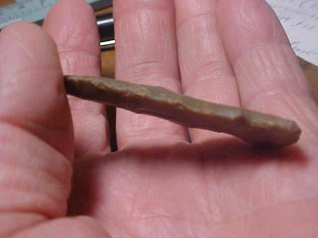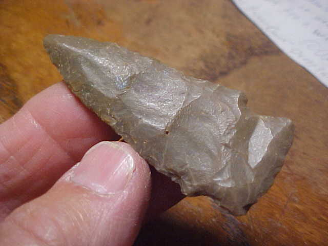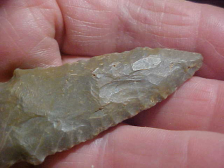 Found along the Ohio River, Illinois side of the stream, Massac County, Illinois--a decent Harpeth River point, 2&1/2" by 1&1/16", and only 1/4" thickness. Harpeth Rivers, with their four-sided-sharpening can have a thicker body, but this point shows very good thinning of the blade--a very skilled Early Archaic Culture knapper, I think. The basal edge shows minor edge dulling--whether that was from wear or actual grinding is a coin flip--the edge work, though, study it in the close up photo, the pressure chipping is excellent. The finder wrote where he found the piece on one face, so that provenance is part of the blade--guaranteed authentic in every detail. Shipping is $8.00, checks or M.O>s are the ways the piece can be purchased. Sorry, I do not use paypal-type services--Roy A.