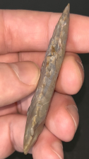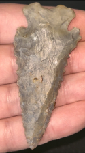 An excellent indented base Dovetail found in central Kentucky. Made from Hopkinsville chert with colorful inclusions throughout. Very finely made with steeply beveled and serrated edges.