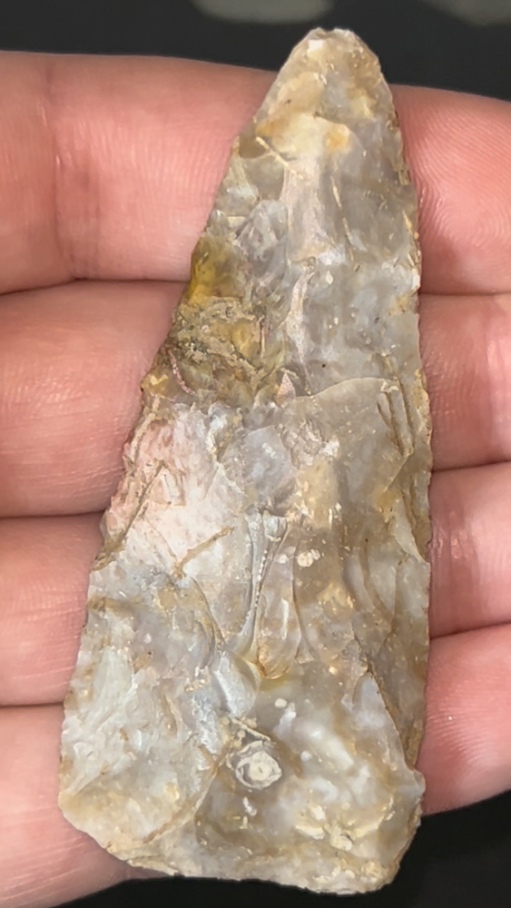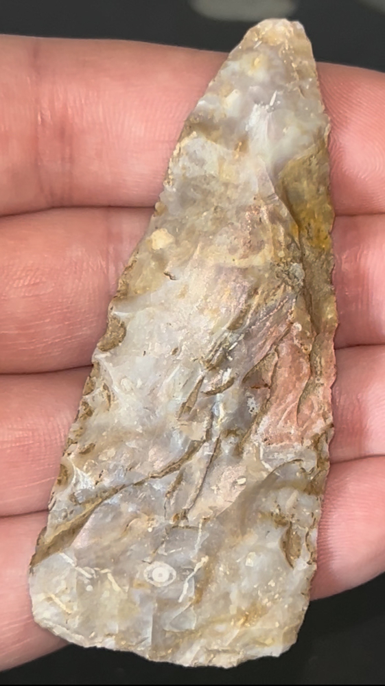 A fine blade found in central Kentucky. Made from colorful Boyle chert that is well patinated with some nice fossil inclusions. Well made with good symmetry.