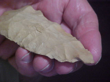 Shipping included on this 3&13/16" by 1&11/16", half inch thick flint (actually a river cobble Jasper) knife, Kentucky or Tennessee in origin (provenance)--authentic piece made from a super hard material that must have been chosen for its ability to stay sharp longer than most flints. The basal edge was ground either for hafting the knife, or so it fit the users' hand without cutting the palm--hold the knife, you'll feel how it fits around the base of your thumb--some ancient user, they planned ahead. I welcome checks or money orders, but do not use paypal-type services--Roy A.