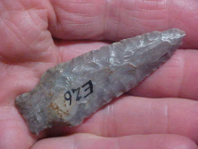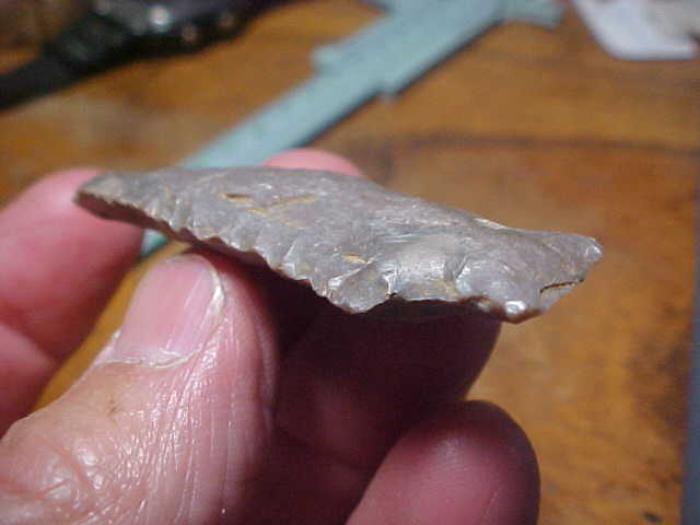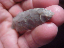 A well made Little Bear Creek point out of either southern Kentucky or northern Tennessee, the type hornstone (with fossil inclusions) could come from either state...and the last collector/ owner didn't offer any additional provenance. Length is 2&7/16", and likely that's an eighth inch shorter than the point was before a tip impact fracture--whatever they hit with the dart point that last time out, they hit it hard enough to flake-away the side of the tip (see close up photo). Width is very classic at 7/8" as these are more narrow dart points, and thickness is 3/8". Being one of the four-side-sharpened (quadra-facial) points, you expect a slightly thicker medial ridge. To wrap that description in a nice package: the piece is exactly what it's supposed to be, it fits every guideline for point type & authenticity. Shipping is $8.00 with checks or M.O>s how I take payments. Please note that I do not use paypal-type services--Roy A.