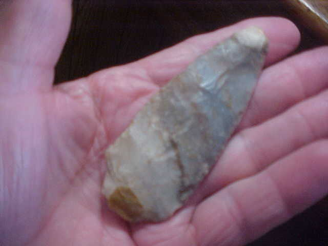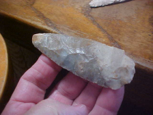 Made of a colorful form of Kentucky Sonora Flint, this Morrow Mountain point measures 3&9/16" by 1&1/4", a thickness of 3/8" in the hafting area, the blade thinning considerably as it reaches the tip of the hafted knife. The tip has some use dulling and rounding, as the pics show. The stem is that Morrow Mountain "barely a stem" short 'shank'--with use-made ding on a corner of the stem--under a 10x loop you'll find minerals and dirt in the slight break. The colors along the blade range from cortex material to high grade Sonora Flint, ALL showing great patina. I wish I could offer more provenance than "Kentucky", but that's what I got with the multiple lot group. Regardless, every detail is guaranteed authentic. Shipping is $8.00 with checks or M.O.s the only ways to purchase the piece. Sorry, I do not use paypal-type services--Roy A.