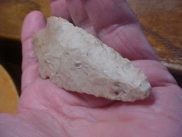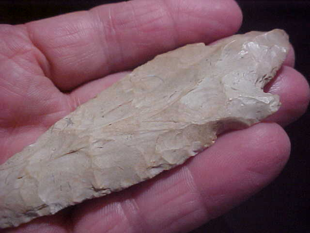 From a Bond County, Illinois, area collection, a 4&1/8" by 1&9/16", 3/8" thick Waubesa Adena Knife--a big piece of VERY patinated Burlington Chert. From the slight red coloration the Burlington was heat treated, iron oxides 'gave tone' to the normally white chert--and more easily knapped quality (makes the flint harder, allows for more fine pressure chipping). There is slight grinding along the stem edges, there is heavy use-wear on the blade edges and the tip. A shaft scraping indention shows down toward one barb--it gave the tool a more multi-purpose function--you can feel the use wear in the indention. How many decades back the knife was found wasn't recorded, but very (VERY) obviously a piece of flint of this size wasn't a recent surface find--it's real, period. Shipping is $8.00, and can be purchased only by check or money order as I do not use paypal-type services--Roy A.