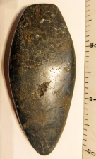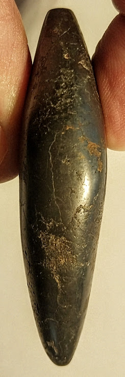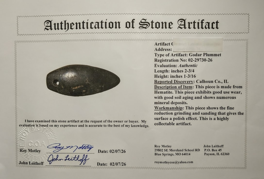 This very heavy Godar Plummet is made from Hematite. It was found in Calhoun Co., Illinois, and comes with a Roy Motley COA. This is a rare artifact made from a very desirable material for collectors.