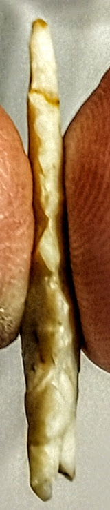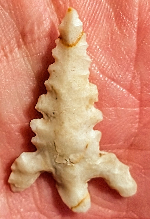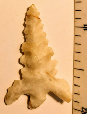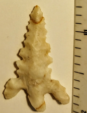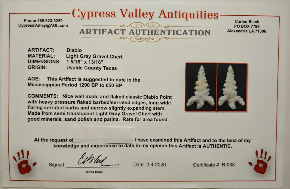 This rare Diablo arrowhead point is made from a light gray gravel-chert. It was found in Uvalde Co., Texas, and comes with a Carlos Black COA. A great addition for your Texas bird point frame!