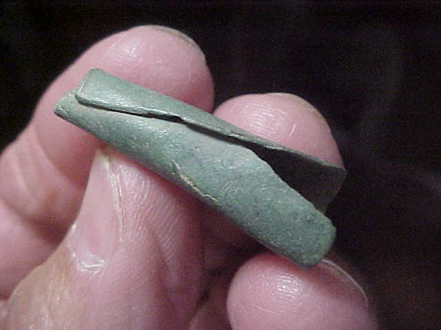 A Henderson County, Kentucky, artifact--found decades back on a very Late Mississippian village site. These were the descendants of Mid-Mississippians who had left Indiana's Angel Mounds, survived along the Ohio River, farming the lowlands long enough to have contact with (most likely) French traders. The French brought along copper (or brass) cookware to trade with 'locals', but to the locals the shiny (new) pots and pans were quickly chopped up, rolled into beads for stringing on necklaces and the wider pieces made into armbands--they were a 'status symbol'--give the copper 350 years +/-, the metal verdigris a deep green. Forty years back I winter-hunted the site where these beads were (if not common) at least possible to find. The copper was so localized the site became known as "Copper Corner"--so that's exactly where I suspect Bob (the finder) picked up this piece. Stated VERY simply: it is real. Shipping is $8.00, checks or M.O>s are the ways I take payments. Sorry, I do not use paypal-type services--Roy A.