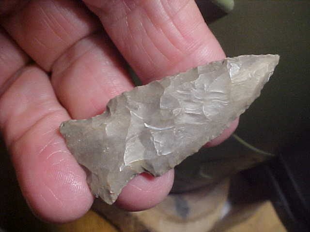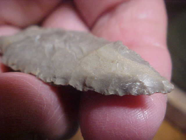 An Indiana point, Spencer or Warrick County, Ohio river find made of a very good grade of Hornstone, 2&1/8" by 13/16"--as is classic for the point type, thin, only 1/4". The sides of the stem have light grinding, but not much on the basal edge (corners only)--these Late Hopewell points can often show grinding, one of the few Hopewell point cluster types that do (like Steuben points). The sharpening technique left the piece with a very slight blade twist--as a dart point that might have helped with flight. One source I've read said these Lowe Points may have been the Hopewell peoples' first true arrowheads--seems a little large for an arrowhead when you think of the small triangles the Mississippians used, but an archer might have a different 'take' on it--you try to consider all the possibilities for how a piece was used. Every detail is guaranteed real--only damage I've spotted is what looks like a tiny flake off a quarter inch below the tip--that may be a handling ding from before I go the piece in my collection--a close up will show that tiny chip. Shipping is $8.00, checks or M.O. s are how I take payments. Sorry, I do not use paypal-type services--Roy A.