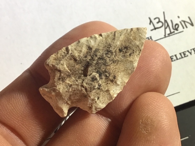 Made from a white fossiliferous chert that has spent some time in water, this Tablerock is from Pike, County, Missouri and from the Frank Waelder Collection. It shows water and use wear on the lateral edges with heavy ancient soil staining on one side to a nice tip. It comes with a Rogers COA and I have the shipping.