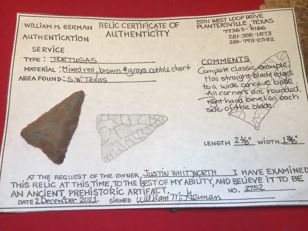 This Tortugas has a heavily thinned base with slight right hand bevels. It is thin for the type made of mottled Chert. It comes with a Bill German coa. I have the shipping.