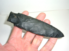 THIS SPECTACULAR STRINGTOWN LANCE IS PROBABLY ONE OF THE 5 BEST EXAMPLES OF IT'S TYPE TO EVER COME OUT OF THE STATE OF OHIO. IT RESIDED IN ONE OF THE LARGEST COLLECTIONS OF RELICS COMING OUT OF THE LATE JIM BARKER'S COLLECTION. MOST OF THIS COLLECTION WENT TO BOB CONVERSE AND WAS AUCTIONED OFF SOME YEARS AGO. THIS ONE DID NOT AND RESIDED IN THE TERRY YERIAN COLLECTION. THIS COLOSSAL STRINGTOWN WAS FOUND IN PICKAWAY CO.OHIO AND MEASURES AN INCREDIBLE 5 9/16"! LIKE MANY PALEO STRINGTOWNS,IF YOU CAN EVER CALL THIS TYPE REMOTELY COMMON, IT IS MADE FROM BLACK COSHOCTON FLINT. A REALLY BEAUTIFUL AND SPECTACULAR PIECE!
