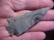A Warrick County, Indiana, find, nice, very patinated piece of Indiana Harrison County-type Hornstone, 3&1/4" by 1&1/4"--VERY good length, and a max thickness of only 5/16", so the 'balance' is there, too. The width insside the basal notches is closer to the "E-notch form" of the Big Sandy than a standard or even Broad Base Big Sandy--one side, the base is more than a square notch, it hooks upward--that, I's why I type the Early Archaic point as an E-notch. Interesting features in the construction of the piece--the blade is beveled on only one face, both edges; the reverse isn't flat, but it's not far from it. You can take from that that there were a considerable number of ancient sharpenings. One other feature that doesn't seem to have an explanation is that the basal edge is NOT ground--deliberately not ground. Answering that "Why", when it's a rarity for Early Archaic points in general to have ground bases--why isn't this one? The piece is 100% guaranteed authentic, the patina is there, but I can't explain that basal edge--next artifact show I see Jerry Dickey I'll get his thoughts on the subject--I respect his opinions. Shipping is $8.00, checks or M.O>s are welcomed. Sorry, I do not use paypal--Roy A.