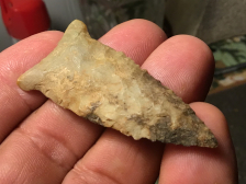Recovered in Travis county, this has the heavy right-hand bevels at the base typical for the Nolan Projectile point. It shows heavy use wear with a white tip. It is thin with superior flaking and comes with a Bill German COA. I have the shipping.