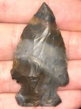 A fantastic Thebes found in Dubois County, Indiana. Made from beautifully creek stained Hornstone. Outstanding style and form with lightly serrated beveled edges and heavily ground base.