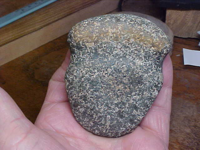 A Full Groove Early Archiac timeperiod axe made of a black & white speckled granite.3&3/16" by 2&9/16", yet only 1&1/8" max thickness--NICE polish with an iron stained heel. The piece is from a S.W. Indiana collection. There is considerable ancient work-made dulling to the bit--7500 BP work. Guaranteed real, period. Shipping is $10.00, checks or M.O>s are welcomed. Sorry, I do not use electronic payment forms such as paypal--Roy A.