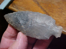 A S.W. Indiana MacCorkle, either Spencer or Gibson County; length of the dart point is close to 1&7/16" by 1", slightly under a thin 1/4" max thickness, no restoration, no damage, simply a fine Early Archaic Bifurcated style--note the one barb is (under 10x loop magnification) an inclusion of a higher grade of silicate--looks restored, but isn't). On the base of each lobe there is slight dulling--the kind of light dulling you can call 'grinding', but that's stretching the definition of " basal grinding". The flint is a fossil-bearing material, silicate crystals (quartz) have replaced one fossil that went through to each side---close up photo should show the crystal pocket. Patination is excellent, every detail is guaranteed authentic. Shipping is $8.00. If buying, please note this store welcomes only checks, cash, or M.O.s, you can't pay with paypal-type payment services--Roy A.