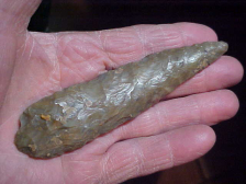 Out of a Hopkins County, Kentucky, collection, but whether the piece was found in Hopkins County, or was found nearer Paducah, where the man previously lived, that is unknown--trying to match-up that fossil laden flint with types found in the area, I've drawn a blank. The material may be something that reached the Ohio River from the Illinois counties--a Kincaide Chert (due to all the fossils present)--that's my best attempt at classifying the material--even looked at a Bailey Chert that was heat treated. When you have one piece in a whole collection, you know the finder lived in more than one location, you draw on every resource you can to identify 'difficult to classify' cherts. Length is 2&13/16" by 1&1/2", barely over 1/4" blade thickness. Being a Motley there is no basal edge grinding, but the sides of the stem are definitely ground. One barb is slightly shorter than the opposite barb, and that's the sum of any damage. Patina is great, the piece is guaranteed real--please note there is a red washed-out stain on one face, it looks like someone once wrote a bit of provenance in a red ink, then decided to remove it--doesn't come off. Shipping is $8.00 with checks or M.O.s welcomed. Sorry, I never ever use paypal--Roy A.