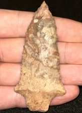 A fine Matanzas side notch found along the Ohio River in Harrison County, Indiana. Made from a heavily patinated colorful fossil chert. In good condition and nicely made with a lightly ground base.