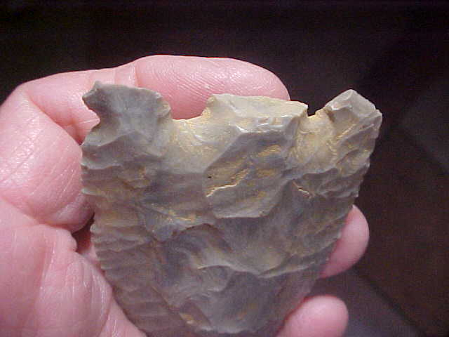 A banded form of Harrison County, Indiana, Hornstone, 3&3/16" by a wide 2&1/16"--close to (but slightly under)3/8" along the medial ridge. The Daviess County, Indiana, find has never been washed, field dirt still in the crevices--you see it as it was found. The base must have snapped shortly after the point (knife) was made, there being very little sharpening along the blade edges. The sheer width confirms that, the blade would have been narrowed by any sharpening. Note the "re-hafting" notch on the longer barb--an attempt to fit the big knife to a new handle, tie it with sinew. The shorter barb was salvaged at an angle, then highly polished. How that'd help tie the piece securely I'm not sure, but the polish is deliberate; they HAD a reason. On the notched-barb side there is a shaft-sharpening indention, use-polished as well. There is slight use--some wear, off the side of the tip. Small wear spots such as that came about from a specific function, call it a 'secondary use'--most ancient tools had those extra functions, they were part of a toolkit--and you could only carry along so many tools as you traveled. Every detail of this piece is lifetime guaranteed authentic. Shipping is $8.00, and I welcome checks or M.O.s, but please note I do not use paypal--Roy A.