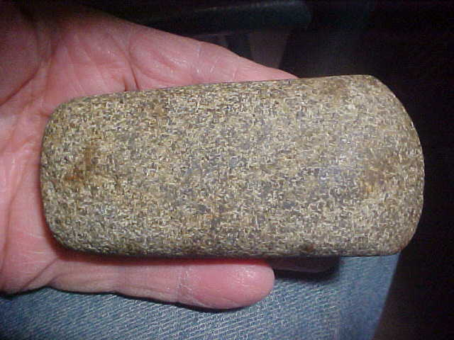 Out of the Union County, Illinois, area--Anna, IL--granite and measuring 4&1/8" by 1&15/16", but only 1" max thickness. While the bit is 'use dulled' , it's really well polished, and very slightly flared. The form is excellent, only on the heel do you see a 'rougher' form--and that's due to the shape of the granite river cobble the maker (Mississippian Culture, I'm supposing) began with. Every detail is guaranteed authentic. Shipping is $10.00, checks or M.O>s are welcomed. Please note I do not take paypal, though--Roy A.