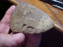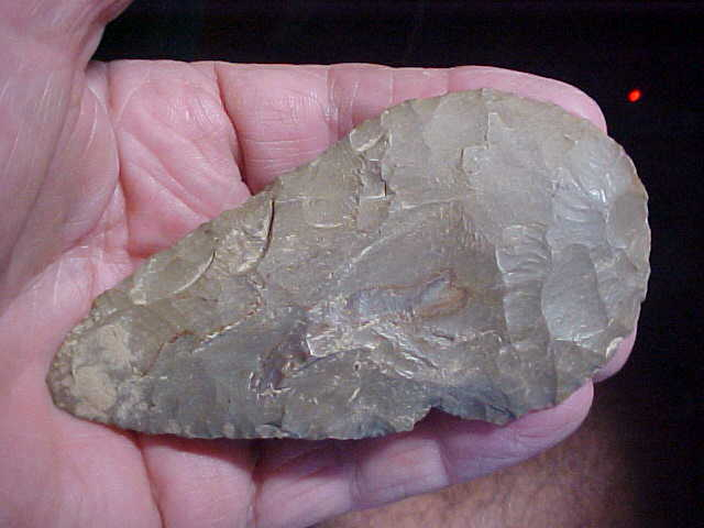 A creek find from Warrick County, S.W. Indiana--made from hornstone, slightly over 3&7/8" by 2&1/16", only 3/8" max thickness. I left the piece exactly as-found, mud and all--you see it exactly as the finder must have. There being no bevel sharpening, the knife is a first stage of the Cobbs Knife form. There is a tiny tip chip and that side repair--or shaft sharpener--cut in to the edge. It's sharp-edged in the indention, so if it was intended as a shaft scraper, it didn't get much use before being lost in a creek. Absolutely every detail is guaranteed authentic. Shipping is $8.00, checks or M.O>s are how I welcome payment. Sorry, I do not use paypal-type payments--Roy A.