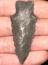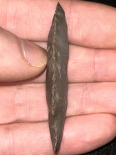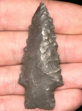 A fantastic Heavy Duty found in Washington County, Indiana. Made from high quality glossy grey Hornstone. Nice form and finely flaked with a sharp tip and serrated edges. Ex: A Johnson and Dr Peter Ward collections.