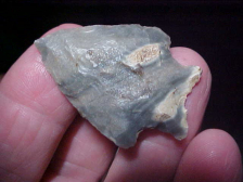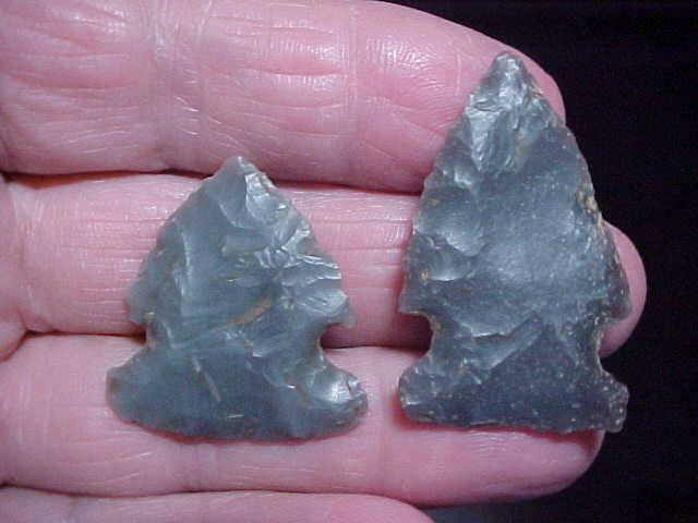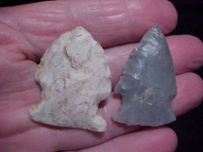 Five exceptional dart points, every one being an Early archaic point type, from Posey County, Indiana--pieces I'd had stored "for a rainy day"--today is it. There is a Pinetree, a Bifurcate and three forms of Big Sandy--each shows basal grinding, although the bifurcate seems lighter on the grinding until you get to the sides of the stem--excellent grinding on both outer stem sides. Four are Indiana hornstone, slight variations in color--the fifth is a off-white flint--maybe Burlington, but I'm thinking it's some other white flint--SUPER heavy basal edge grinding on that point. The longest two measure 1&5/8", 1&1/2" on the white side notch, 1&3/16" on the smaller side notch. If that smaller point had more identifiable blade I might place it in the Warrick Point class due to the heavy basal edge grinding & the base form--too worked down to be sure, but not many point types went that heavy on their basal edge grinding. ALL are guaranteed real, period. I welcome checks or M.O.s, but do not use paypal--Roy A.