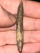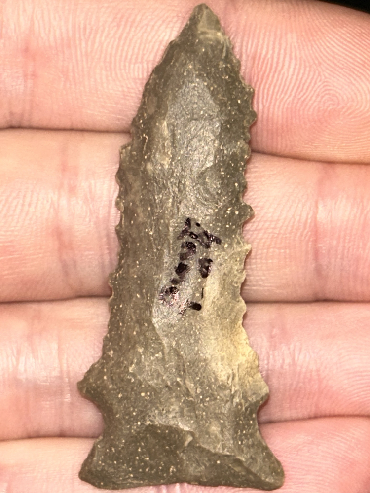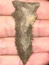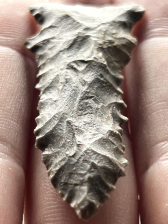 A fine Pinetree found in Marshall County, Alabama. Made from well patinated medium brown Fort Payne chert. Well made with serrated edges and ground base.