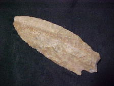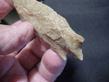 A S.W. corner of Indiana creek find, one I put in a frame last year with a "What is it?" note. Length is 3&1/4", not quite to 1&1/8" width, and a thick body due to the rough Indiana Holland Flint that reaches 7/16" max thickness due to a strong 'stack' in the flint. The base, though, is interesting, auriculate and strongly ground--the pressure chipped blade edges also testify to the piece being Early Archaic Culture. The closest I've come is that the piece is some variation on a Heavy Duty Point. I acquired the piece with a small modern chip on the very tip--price reflects the damage, but it also wouldn't be the first point found n a creek where a deer stepped on the piece. Creeks are like interstate highways for deer, the foot traffic can churn up the gravel beds as deer start moving in the fall. Neat piece, guaranteed authentic. $8.00 shipping as the USPS keep finding reasons to increase postage. I welcome checks, cash, or M.O.s, but do not use paypal--Roy A.