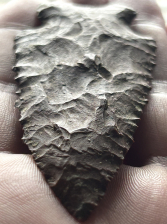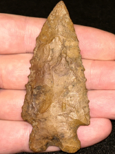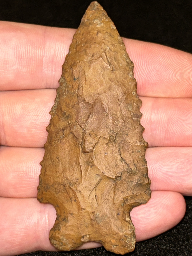 An outstanding MacCorkle found in Benton County, Tennessee. Made from heavily patinated orange-brown chert (likely Fort Payne) with great mineralization. Nice size with excellent flaking and workmanship.