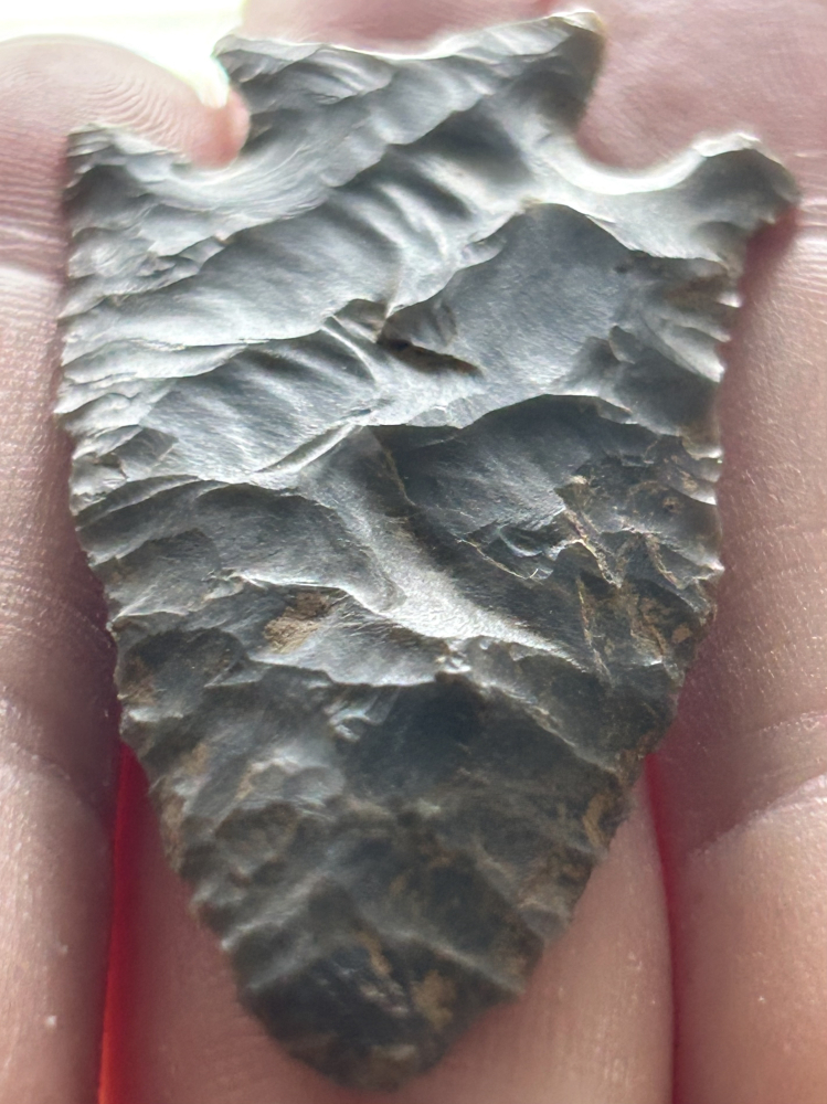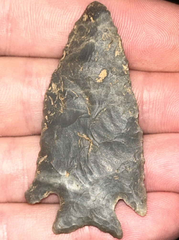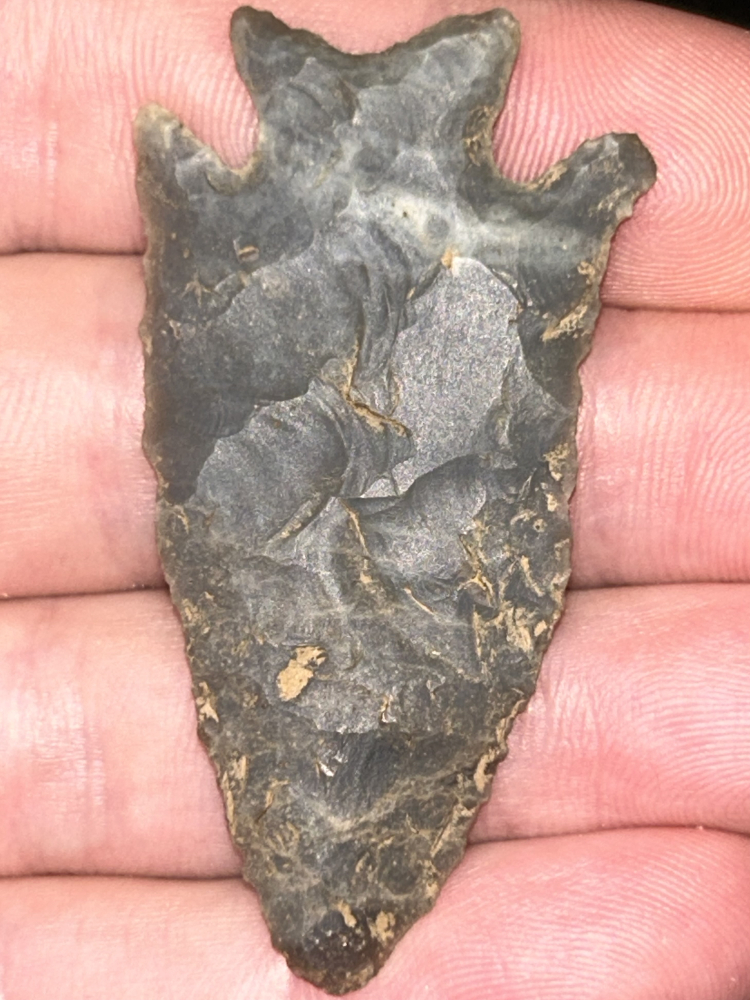 A fine Kirk found in Meade County, Kentucky. Made from beautiful blue-grey Hornstone with two neat translucent spots in the point. Extremely thin and well made with great style.