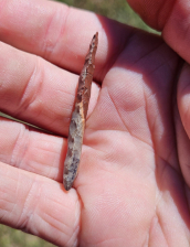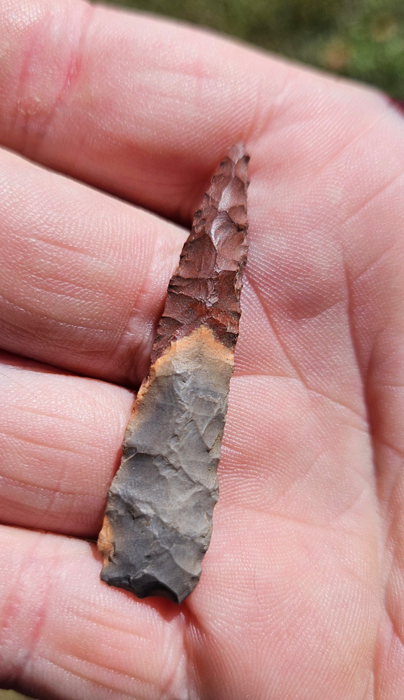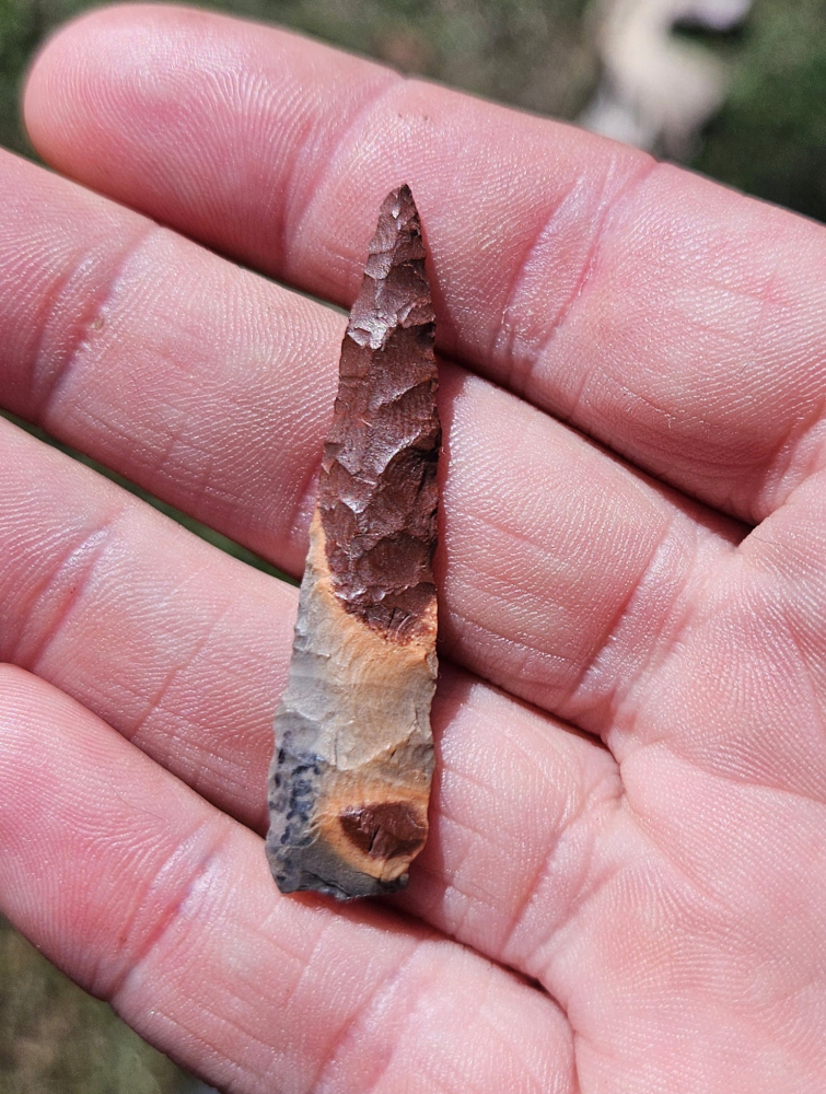 Exceptional pencil drill from Fulton County, KY. Very well worked and likely mississippian period, made from stunning colorful horse creek chert. Measures 1 7/8 inches long. Highly recommended relic!