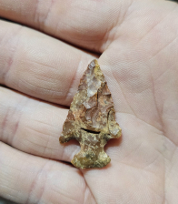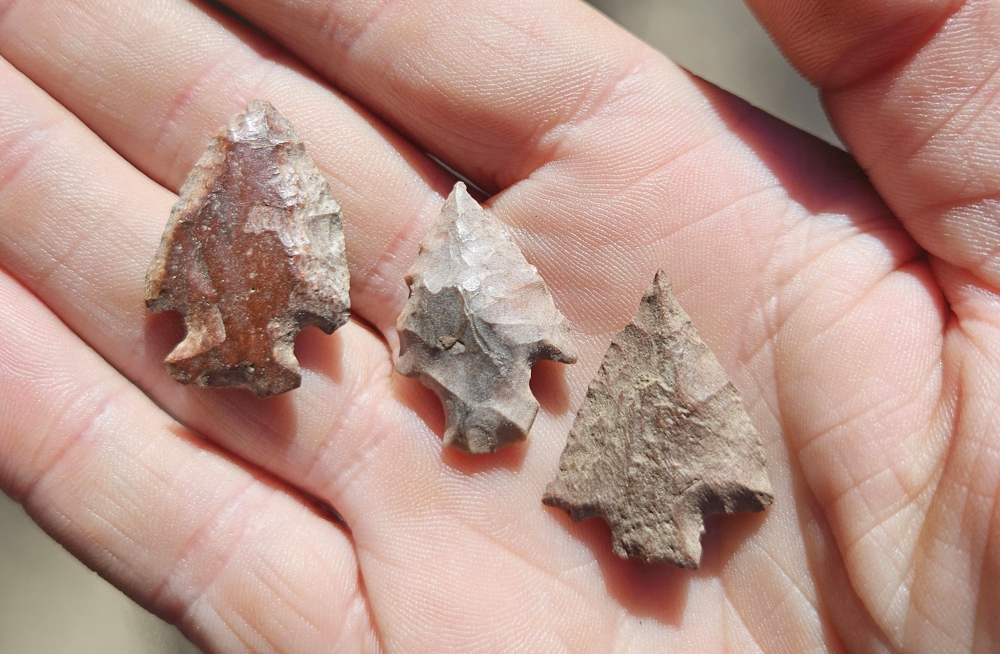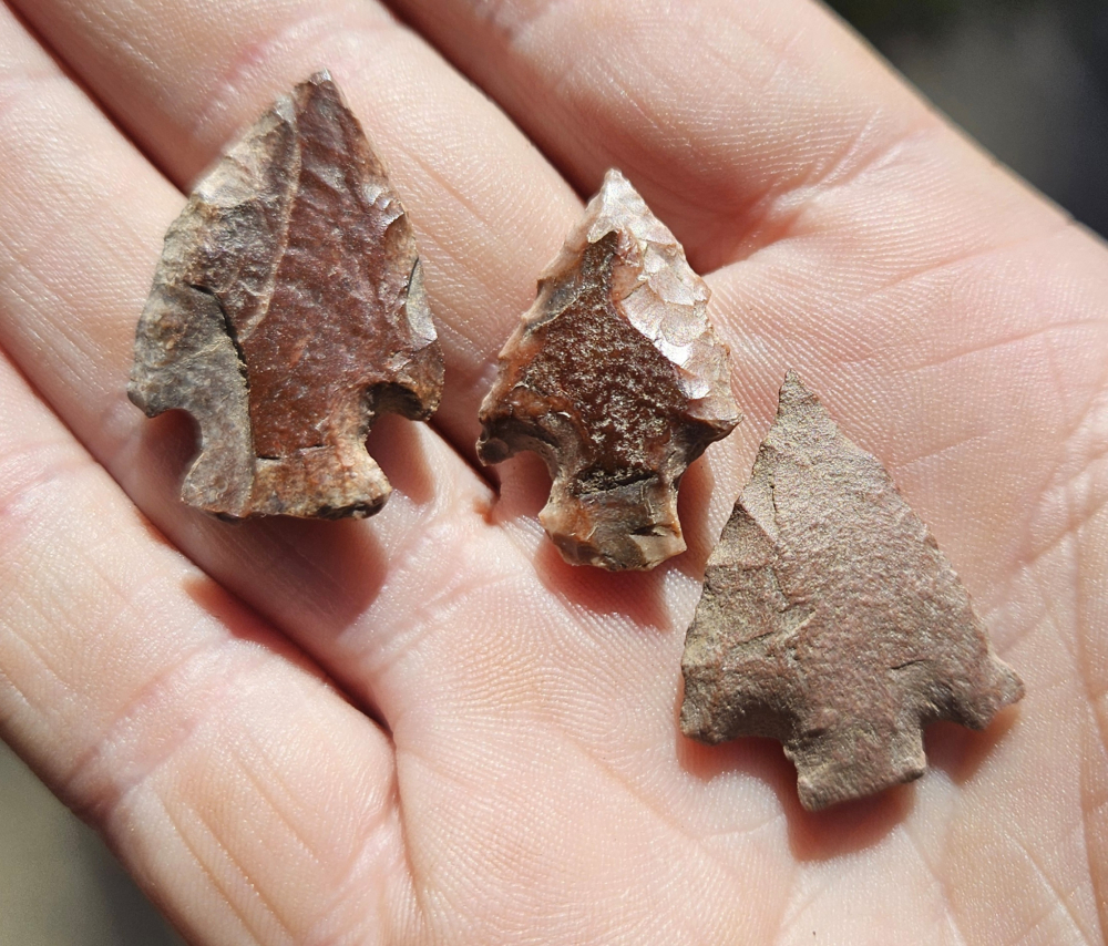 3 nice Riverton atlatl darts from Ohio County, KY. Nicely made from colorful heat treated cobble cherts. Largest measures 1 inch. Great little trio!