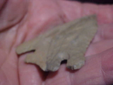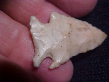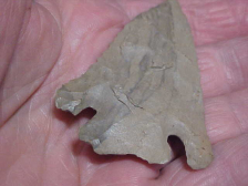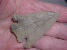 Warrick County, Indiana, a piece that's been in my collection almost fifteen years now--fine grade Pinetree that's made of a "grade" of Hornstone, some inclusions in the flint so I know it isn't our typical Harrison County, Indiana, Hornstone. Length is very slightly over 2&1/2" by 1&13/16" with thickness being only 1/4"--good numbers, they tell you the piece has excellent symmetry. The base is intact, but does show where the Pinetree Culture knapper made tiny adjustments to make the blade head fit the handle--whether this was used as a knife or possibly a projectile (I expect it was a knife). The basal edge is auriculate, conforming to the thinner edge of the flake the knapper began working. The tip is the one thing that keeps the price from being higher--an impact fracture to the edge of the tip (see the close up pics from each face). The fracture happened in Early Archaic usage, it dates the same 7500 BP age as the guaranteed authentic blade. I pay the shipping, it's included with the price. Payment: you can send a check or a money order, but please note I do not use paypal--Roy A.