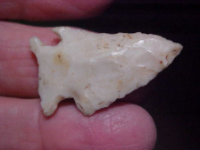 A Lawrence County, Illinois, Pinetree dart--or Palmer, as that Illinois county is right next to Indiana, Palmer points being something you'd see more in Indiana. The basal edge shows grinding, so for that reason I wouldn't call it a Kirk Cornernotch dart--someone else might use that designation as Kirk, depends on whether (in your experience) Kirk darts DID use basal grinding...they just failed to grind bases on their larger hafted knives. Arrowheads, like life, there are always exceptions to the rules. The dart is made of a glossy form of Burlington--Crescent Quarry Chert--patina is obvious, mineral deposits everywhere--length is slightly under 1&3/8" by 7/8", but OBLY 3/16" max thickness. One barb shows an ancient (use-made) end chip--nice 'adjustment notch' made in the base to better haft the piece. Guaranteed real, period. Shipping is $8.00 (USPS Holiday rates, unfortunately)--checks, cash, or M.O>s are welcomed, but paypal is not taken--Roy A,