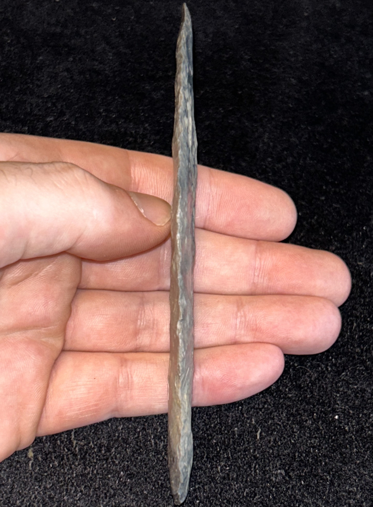 An incredible Adena found in Wood County, Ohio. Made from attractive grey-black mottled Coshocton chert. In excellent condition, extremely thin and finely made with great size. Ex: Charles Strubler collection and comes with Rogers and Jackson COAs.