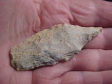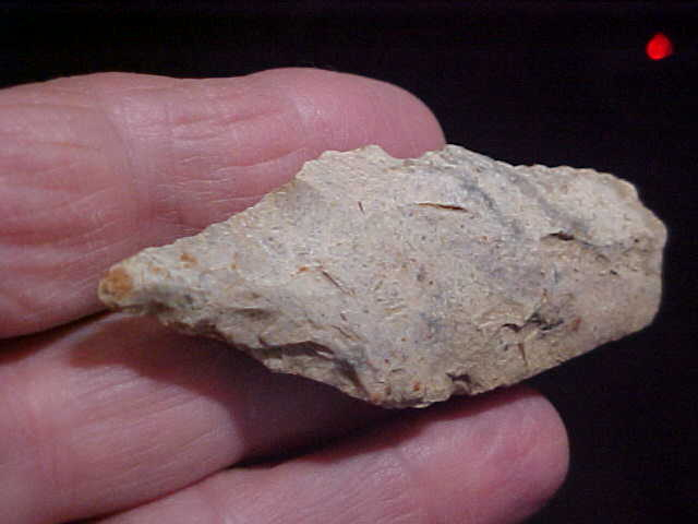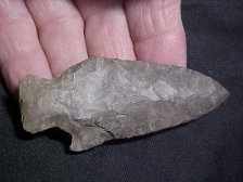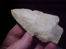 Maybe it's the flint used--Mozarkite, I expect, or a 'rougher grade' of Burlington Chert, but the type knapping makes you think the piece was one of the Middle Archaic--or later Early Archaic lanceolate forms (Nebo Hill or Sedalia)--EXCEPT the lower lateral edges are heavily ground--that's Agate Basin workmanship, not a later 'knock-off'. Could the piece have been made by the Late Paleo Agate Basin peoples, then found and utilized by one of the later cultures--possibly...or possibly the tip repair, the conversion into a drill form, was done "in the field" (not at a home camp). When I start looking at a salvaged piece my first 'look' is at color--i.e. how are the flakes of the 'changed area' different from the body of the piece? In this Agate Basin's case the color (patina) is exactly the same--that tells me the piece was salvaged by the original culture. Even if it (the salvage) had been done 6500BP the patina would never perfectly match the 8500BP patina...and it does. Conclusion, the 3" by 1&3/16" drill form IS Agate Basin, guaranteed authentic, and from Callaway County, Missouri. Shipping is $8.00, checks or M.O>s are how I welcome payment. Sorry, I do not use paypal-type payment services--Roy A.