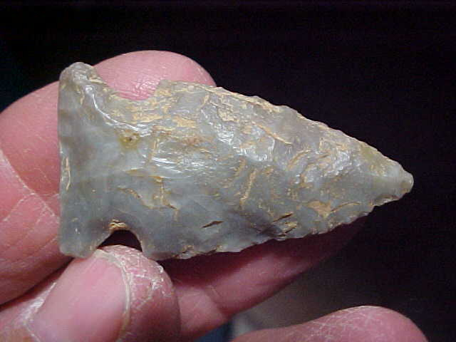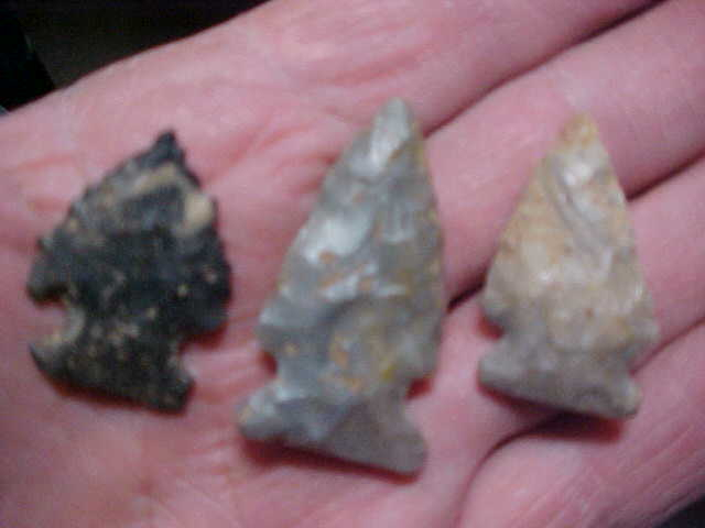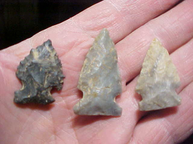Three Spencer County, Indiana, Early Archaic dart points, all somewhere between corner and side-notched--all have ground basal edges. The longest is 1&5/8", Sonora Flint (still has field dirt on it, never washed); the hornstone dart is 1&3/8", and the small (1&3/16") serrated C.N. is Indiana Ferdinand Flint--note the white fossil 'veining'. Three with excellent patina, real, period. Shipping is $8.00, checks or M.O.s are how I take payment, but please note I do not use paypal on my store--Roy A.